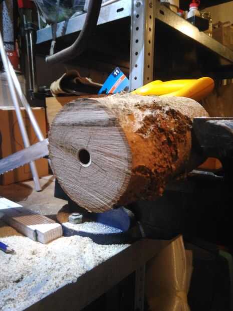 Lo primero es perforar un agujero en el tronco. Para hacer esto, marque el centro de la superficie plana del tronco haciendo dos mediciones en un ángulo de 90°. Porque la mayoría de los troncos no es claramente cilindros, el agujero no tiene que ser precisamente en el centro para que quede bien luego. Luego perfore un agujero de 10mm en el tronco. Probablemente su tronco es más largo que el taladro, para que no se pueden perforar a través de todo el camino. Si es el caso, solo taladro profundo como usted puede, y acabar el hoyo después has cortado el primer algunas rebanadas.