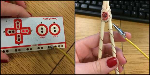 3) clip pinza cocodrilo a la "tierra" en el Makey Makey y el otro extremo en el alambre de cobre en la parte superior de los palillos.