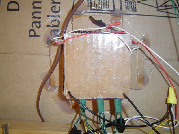 Para iluminar los lugares de la caja para que pueda jugar el juego en la oscuridad he instalado tres blanco LED (cables verdes) por la caja que siempre. Rama de Navidad de LED blancas luces y cortarlas en grupos de tres en una cadena de luces. Perforó agujeros en cada caja y pegado en la posición de los lados y soldadas con un resistente de 330 ohmios (1/2W) para ser alimentado por 12V. Voy a hacer este mismo esto a todas las cajas para el tablero de juego. Luz de LED blanca será en todo momento que el juego está encendido.