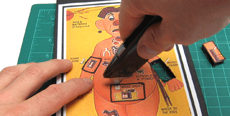 4. recorte cada una de sus piezas marcadas, como se muestra en la figura. Nota: Tener mucho cuidado de no cortar fuera de sus marcas y no para cortar el dedo!