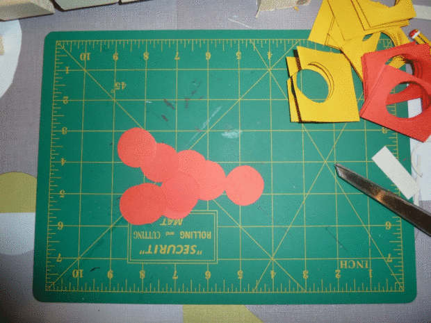 Para '' cuatro en una fila '' necesitamos cortar 16 círculos amarillos y 16 rojo y pegarlos en los cubos.
