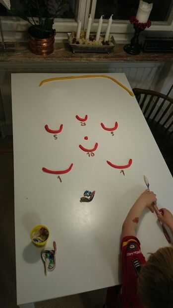 Este es un juego que hicimos para la fiesta de la escuela, utilizando una paleta de cartón reciclada, bebidas botella tapas, algunas tazas de helado de fiesta, tarjeta de repuesto y un montón de pegamento caliente. La idea es como bagatelle (o pinbal