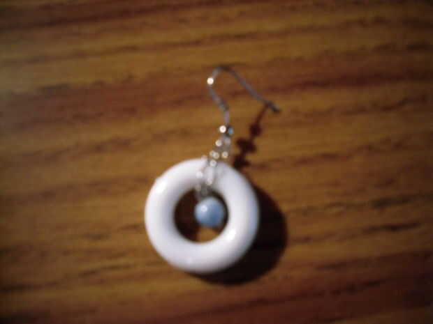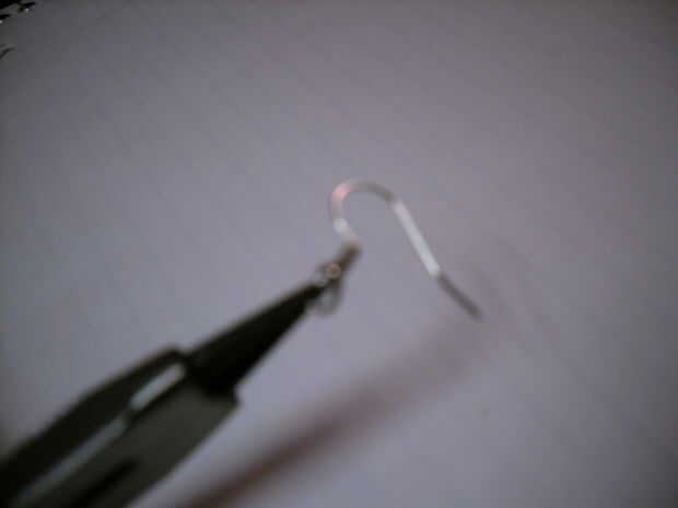 Colocar la cadena y el grano por el grano grande, blanco círculo abierto para que sean una sola pieza. Con los alicates, abrir el lazo de la parte inferior en un gancho del pendiente para que cada eslabón final de la cadena caben en él. Ahora cerrar el ciclo de copia de seguridad con los alicates.