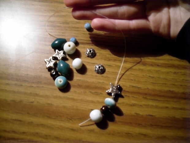 Ahora usted puede Agregar las cuentas de la cadena. Hay muchas posibilidades para crear joyas únicas con encantos y diversos granos. Una vez más, añadir en todos los granos excepto los necesarios para los pendientes (dos pequeño, redondo de cuentas azules y dos granos grandes, blanco círculo abierto).