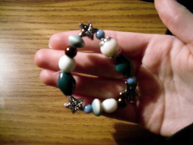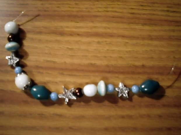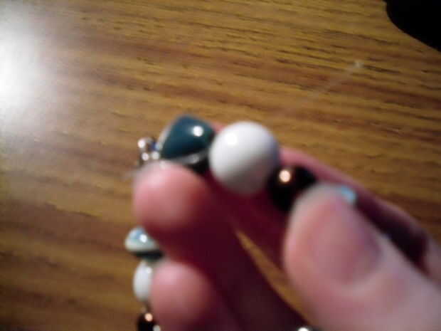 Una vez que todos los granos están en la cadena, debe haber cerca de dos o tres centímetros extra de cadena izquierda. Este monto adicional permitirá espacio para atar la pulsera juntos. Es importante atar la pulsera junto con al menos un nudo doble; tres son mejor. Tirar de los nudos muy apretados para que la pulsera no vendrá aparte. Una vez que los nudos estén apretados, recortar la cadena extra a una longitud más corta.