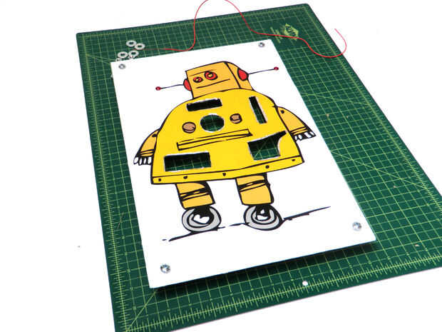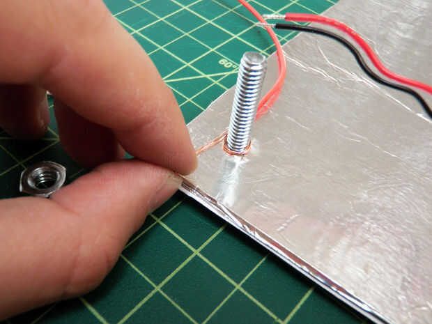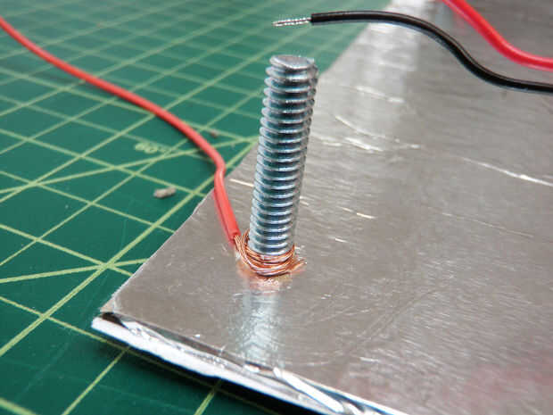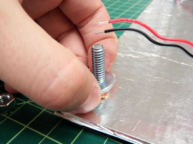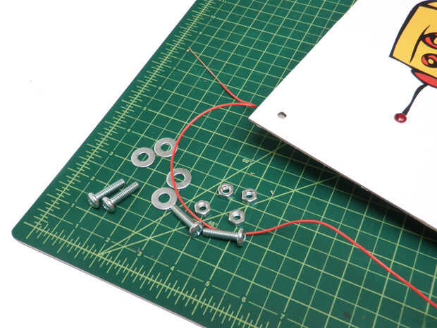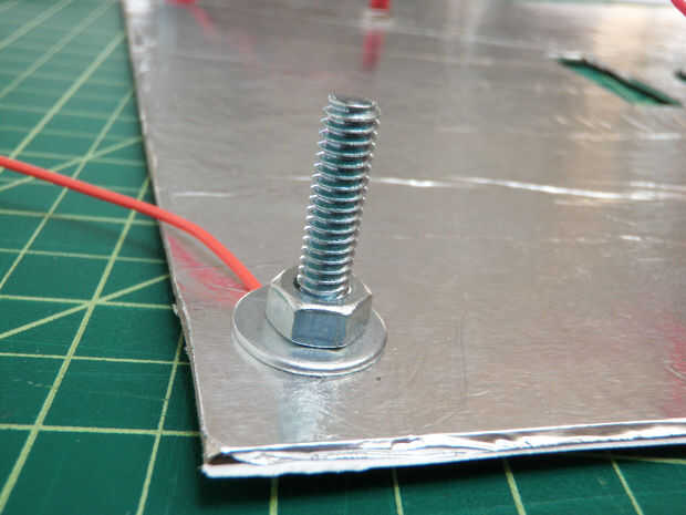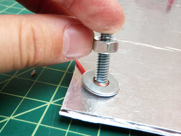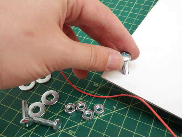 Corte 12" pieza de alambre y exponga tres pulgadas. Envuelva el alambre expuesto alrededor de este primer perno. Poner en una lavadora y luego fijar con una tuerca.
