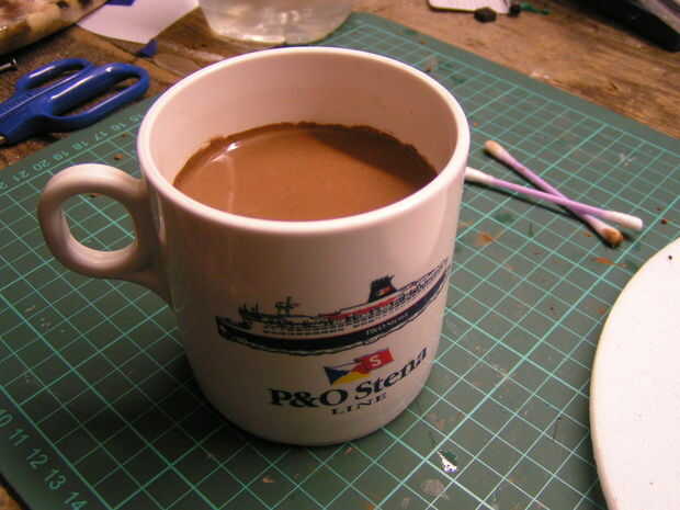 #2 hijo volvía a casa del colegio con una solicitud de una vieja taza. Su maestra decía que era para llenarse de falso chocolate caliente para un rincón de juego de roles sobre el penguins (supongo que aún sienten el frío finalmente) y se arruinó como una taza.