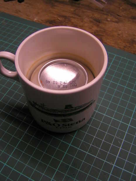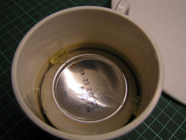 Utilice el pegamento caliente para virar la lata en la taza (que no hacer para que el chocolate caliente y sonajero clang, sería?). Poner un anillo de goma caliente encima de la lata y rápidamente Presione el disco en su lugar, manteniéndolo más plana posible.