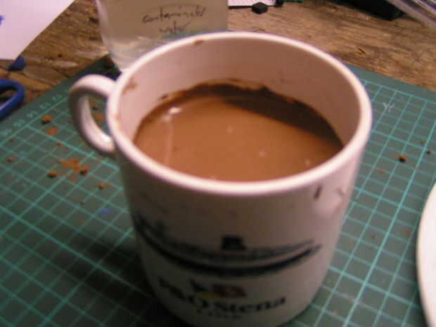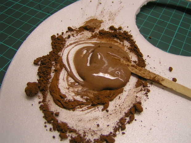 Vierta una gota grande de pegamento sobre el poliestireno y espolvorear sobre algunos cacao en polvo. Revuelva con el palillo. Toma un poco de agitación y quizás tenga que agregar unas gotas de agua para hacer runnier, pero eventualmente tendrás una gota pegajosa, color chocolate.