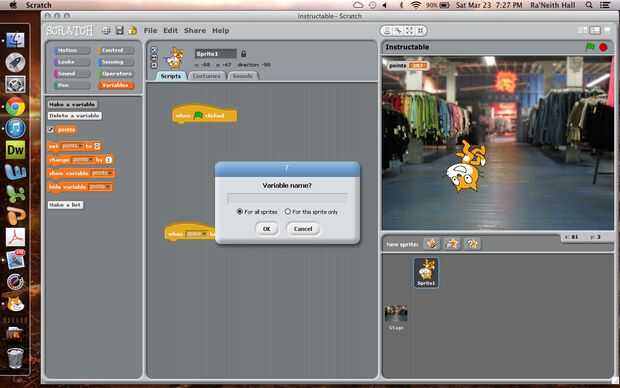 Así que si quieres un juego que se basa en puntos, tendrás que crear una variable (parte superior de la primera columna y a la derecha). Aquí usted puede 'hacer una variable' (su valor es numérico). Usted puede tener sólo un sprite o todos de sus sprites. En este caso, no importa ya que sólo tenemos un sprite.