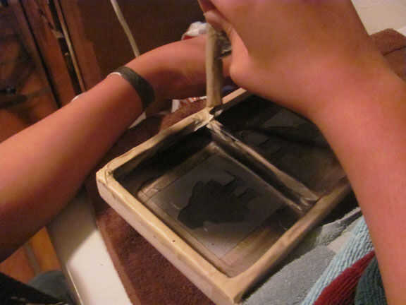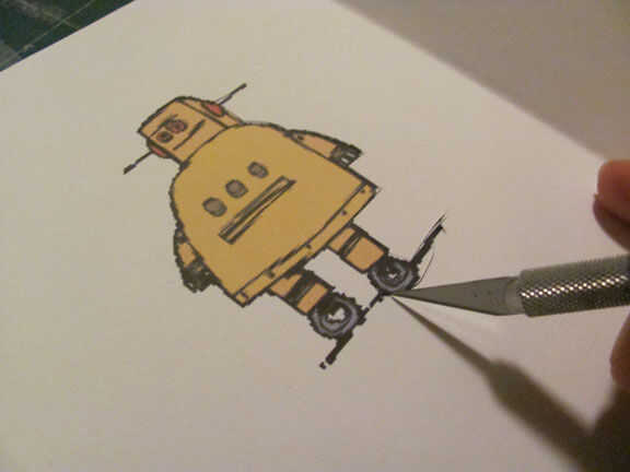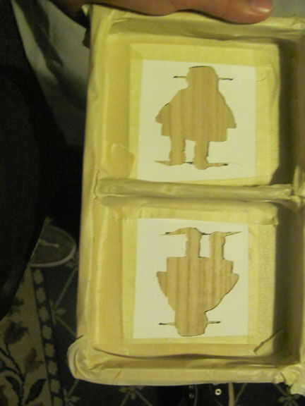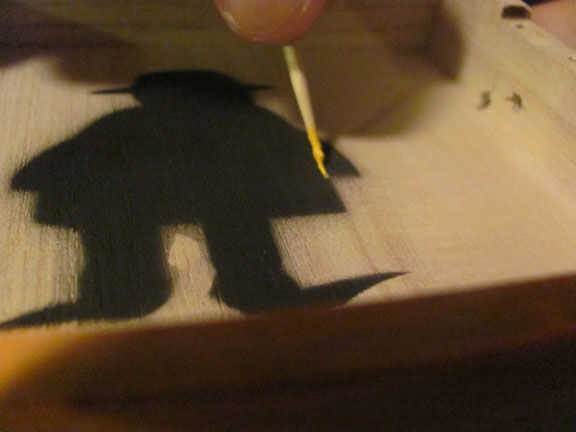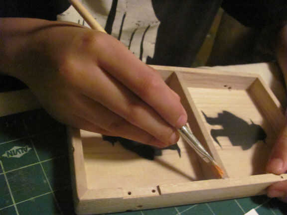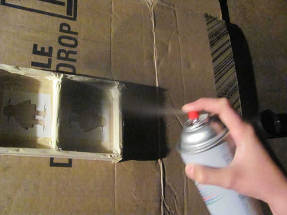 Cortar las plantillas para el robot de instructables, luego con cinta la plantilla en la caja, después de que grabó la parte superior entera de la caja para pintura no en las otras partes de la caja. Entonces dejé que seque, después de me quité la cinta. Entonces agarraron pintura naranja y amarilla y había pintado de los tacos y el divisor y añadir algún detalle al robot. Después de que la pintura se secó apliqué un par de capas de capa clara de acrílico el interior y el exterior de la caja.