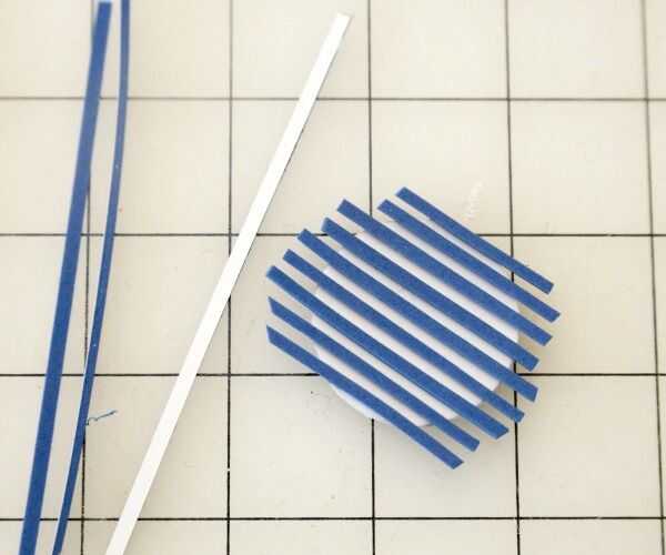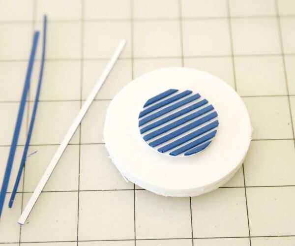 Ahora use su espuma más oscuro para hacer la forma del sello. Decidí que quería uno a rayas y un círculo sólido, así que corte dos círculos 1 1/2"(utilizando un compás para dibujar hacia fuera) y unas tiras muy finas. Montar como en la imagen.