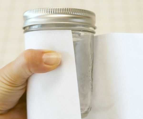Lugar uno de los pequeños 'cup' tarros en medio de un pedazo de papel, a lo largo del borde superior (como en la foto) para que el borde superior del papel confortable contra la parte inferior del labio en la parte trasera de vidrio.