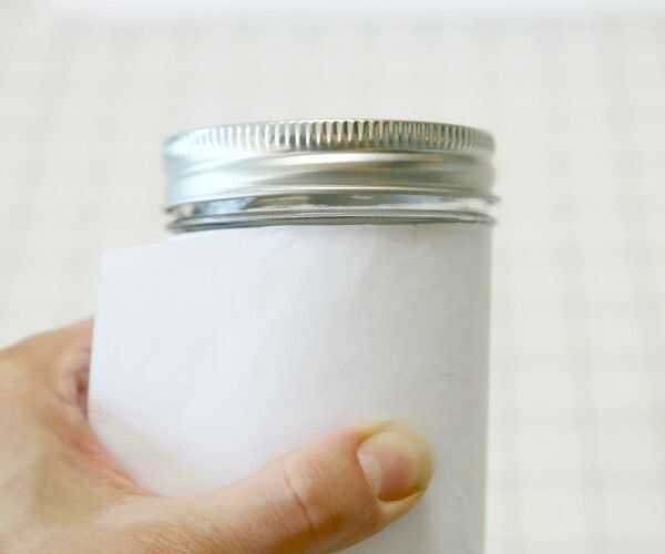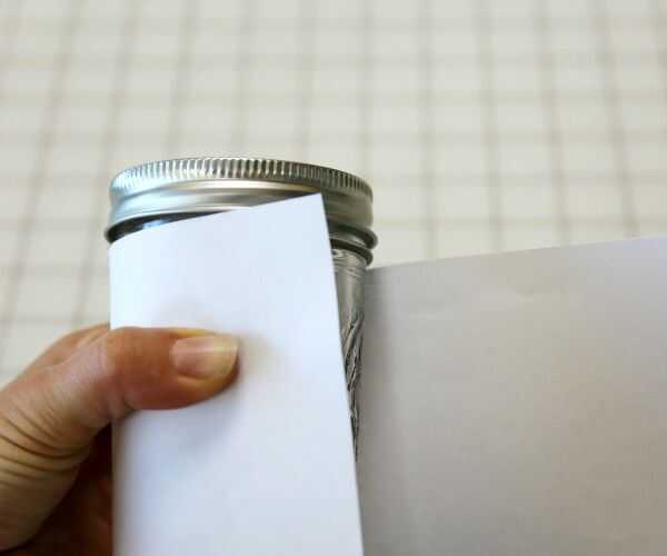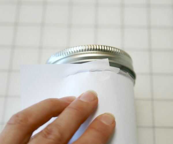 Utilizar su imagen (o un diente del tenedor) para crear un pliegue a lo largo del borde del vidrio. Doblar el otro lado del papel, asegurándose de que el papel es abrazar el tarro herméticamente y arrugue ese lado también.
