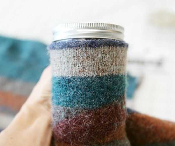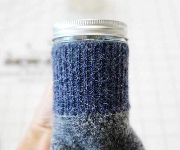 Cada suéter jaspeado tienen texturas diferentes y tal vez incluso colores a elegir. Jugar con tu tela por estiramiento diferentes áreas sobre su taza/termo para ayudarle a elegir qué área a cortar su.