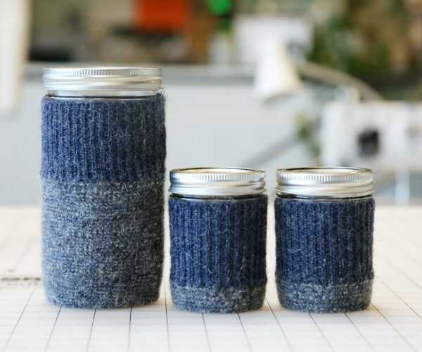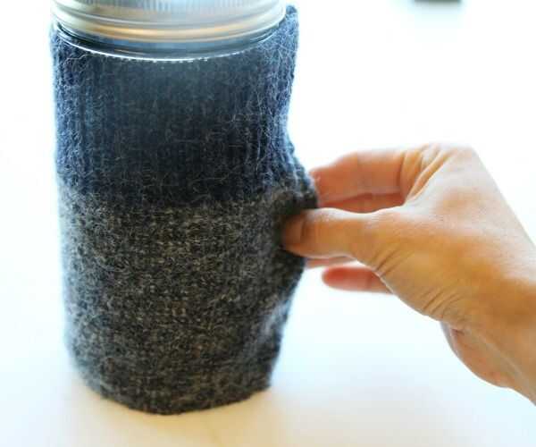 Si cualquiera de sus coberturas son demasiado largo para sus tarros, ajuste la acogedora para que el material adicional está colgando de la parte inferior de la jarra y use sus tijeras de tela cortar la parte sobrante, descansando las tijeras en la parte inferior de cristal como una guía.