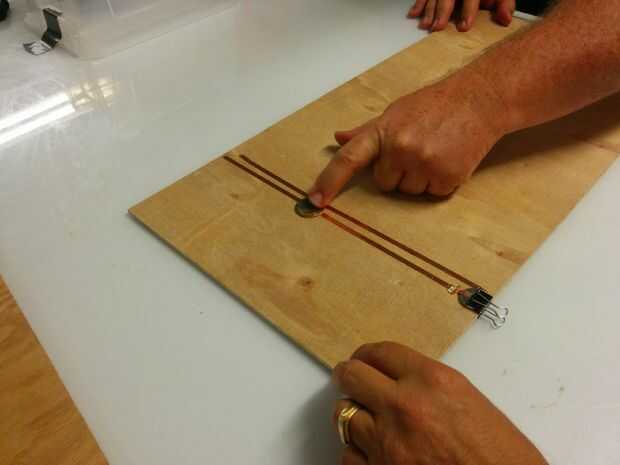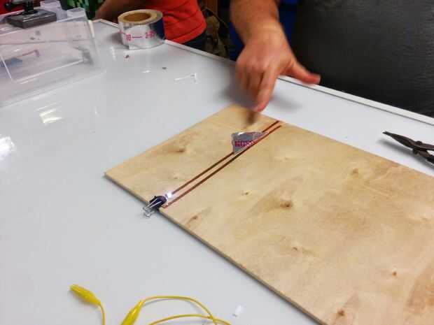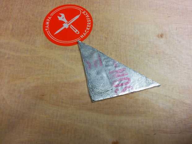 Ahora bien, es el momento para asegurarse de que el LED se apaga cuando juego. Asegúrese de que la batería y LED están conectados, luego ponen una moneda en todo. Esto es donde la cinta de aire acondicionado. Poner la moneda en el medio y lo mejor que pueda, hacer una forma del triángulo. La forma del triángulo es sólo una sugerencia como lo encontramos y película en todos los ámbitos de lo mejor. Lo importante es que hace completamente plana como tiene que ser capaz de completar el circuito a través de la cinta de cobre.
