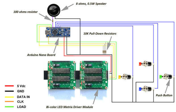 Excepción de los dos módulos de controlador de matriz de LED bicolor y los cuatro interruptores de botón, enganchamos el circuito entero en un pequeño trozo de perf-junta alrededor de 60 mm x 60 mm de tamaño.