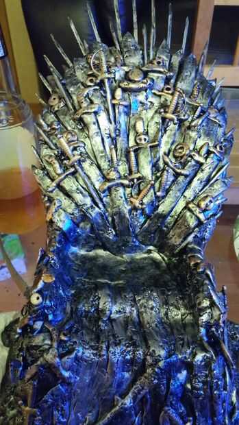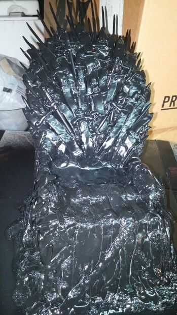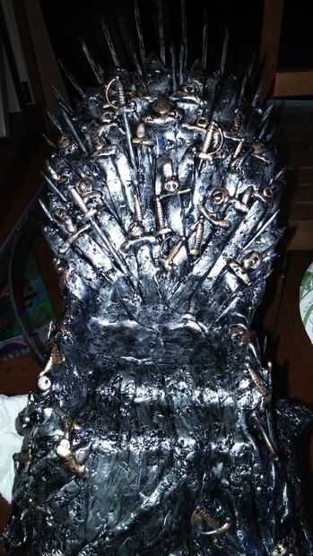 Hornear en el horno hecho (que tomó mucho más tiempo que la caja de arcilla declarada) aerosol pintado de negro toda la pieza. Luego usé un cepillo para pintar de plata sobre la mayor parte de la pieza dejando áreas de negro para mostrar a través de. La última pintura fue oro en las empuñaduras de las espadas. Después de probar hacia fuera, he añadido un peso de globo al frente de la base de la silla en el interior por lo que no podrían inclinar si el teléfono fue fijado duro.