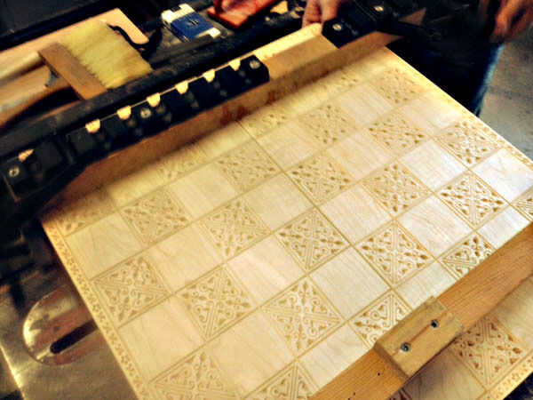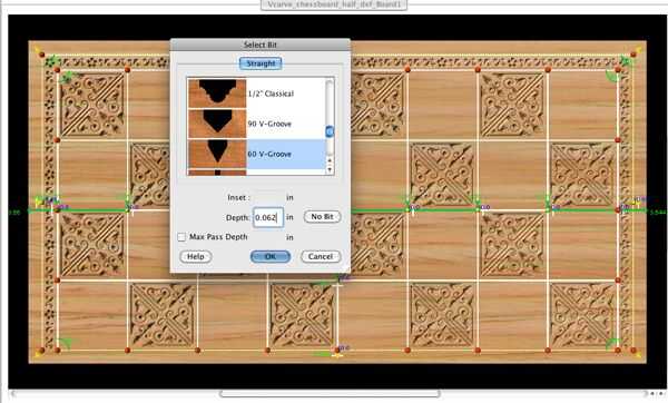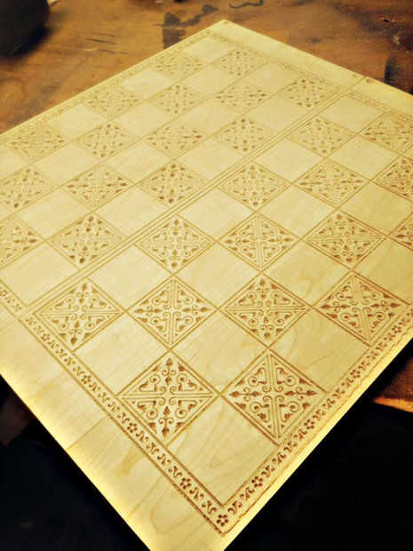 Todo el diseño de la tabla fue dictado por las piezas de ajedrez propias. Cada uno de ellos tiene un diámetro de 2 pulgadas base, que el tamaño de los cuadrados de tablero de ajedrez para ser un poco más de 2 pulgadas. Determiné 2,5 plazas parecían más agradable, que dio como resultado y tablero de ajedrez de 20 pulgadas. Había encontrado un tablero de ajedrez tallado en marfil durante mi investigación que me gustó. Tenía un chip tallado diseño que podía ser recreado maravillosamente con mi CNC CarveWright.