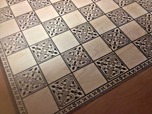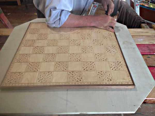 Una vez fabricadas y enruta las esquinas cortadas, lijar la tapa entera para suavizar las variaciones leves que demostraron para arriba en las costuras. También usaba este tiempo a pintar las zonas talladas del tablero de ajedrez. En primer lugar, el tablero de ajedrez entero fue cubierto con una laca de spray para sellar cualquier veta expuesta en el borde de las tallas. Esto es para evitar que la pintura penetre en esas áreas. Luego mezclé con pinturas acrílicas (no lujo), hasta un marrón oscuro con un toque de rojo para recoger el acento de la nuez y el pop con el rojo de la cereza. Esto entonces fue pintado en todas las zonas talladas a v en el tablero de ajedrez. A continuación, lijar la mesa entera, suavizar todas las costuras y eliminar el exceso de pintura.