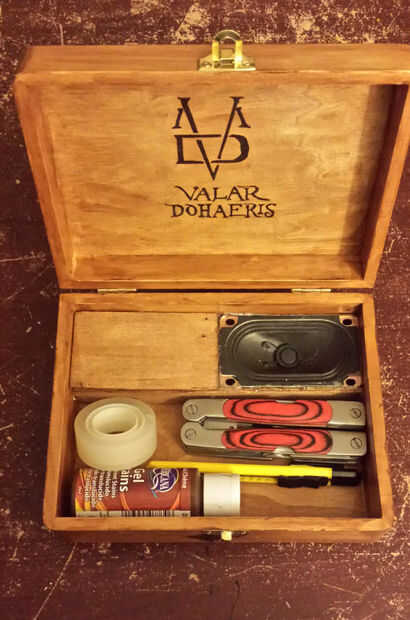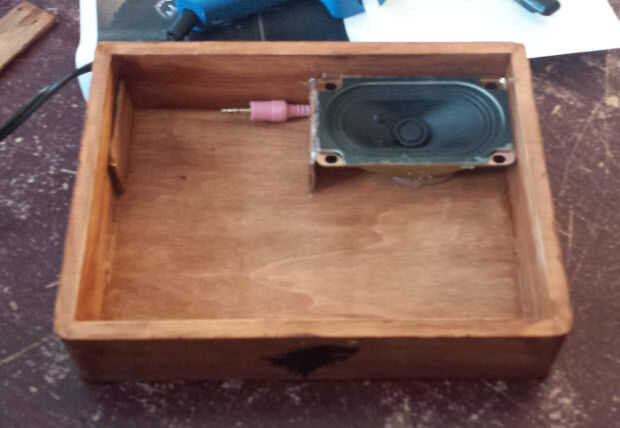 Se necesita otro pedazo de madera para cubrir la sección de MP3. Esta pieza se asegurará en su lugar con un imán, en el cuadro de sí mismo y el otro en la pieza de madera.