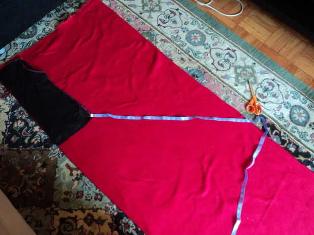 Quería una falda muy completa en mi traje, así que utilicé una cinta métrica para marcar la misma longitud de la cintura de la camisa hacia fuera a las far y de la tela. Luego la usé para ayudarme a marcar un arco de la marca en el borde doblado de la tela. Es importante hacerlo así porque si solo marca directamente enfrente del borde doblado de la tela, los lados de la falda será más largos que la parte delantera y la espalda! Por supuesto, si ese es el look que vas para, tienen en él. Esta pieza será la pieza posterior.
