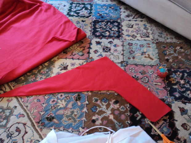 Para hacer las mangas, usé una manga de camisa de otra que tenía y luego esbozado la parte colgante con un marcador lavable hasta que me dieron una forma que me ha gustado. Coloque la parte superior de la manga a lo largo del borde doblado de la tela por lo que sólo tiene la parte inferior coser juntos.
