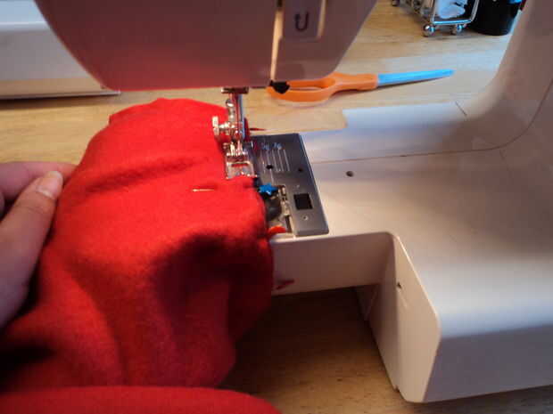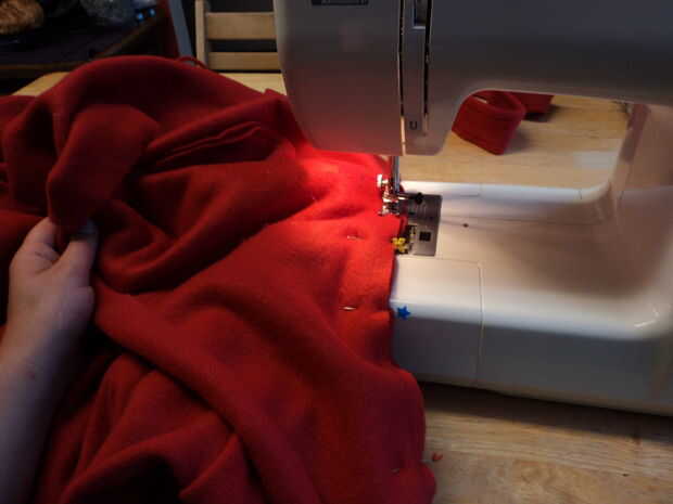 Para coser las mangas, coser la manga juntos por lo que comienza como una manga. Luego, con los lados del derecho juntos, perno en el agujero del brazo. Para alinear, alinear la costura de la manga con la costura lateral de la túnica. Mi máquina de coser tiene una parte que sale por lo que es mucho más fácil de coser tubos estrechos como mangas. Creo que la mayoría de máquinas de coser tienen esta característica. Para ello de ambas mangas. Ahora debería tener un traje con mangas!