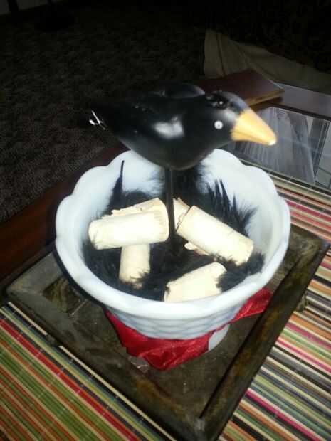 Rollos de Raven: Tomé unas tiras de papel y sumergido en un descafeinada acrílico marrón mezcla de pintura. Arruga para arriba y luego colocar plano para secar. Rasgar las esquinas y los bordes ligeramente y luego escribir una cita de juego de tronos en el desplazamiento. Luego enrollar hacia atrás y coloque junto a una decoración cuervo.