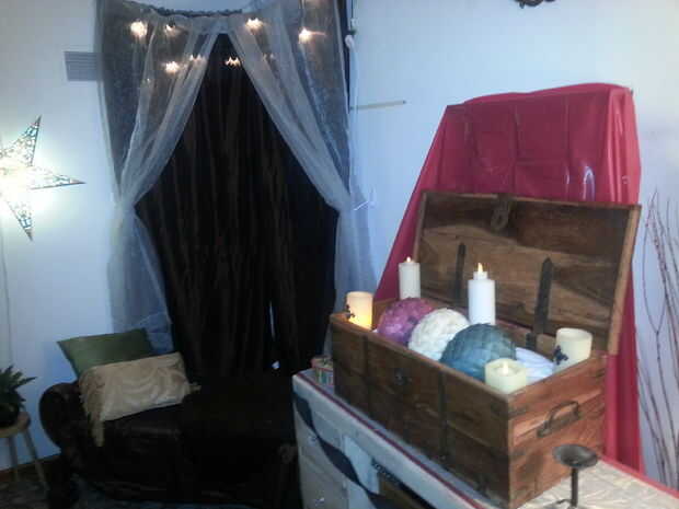Dolthraki tienda - señala una esquina de mi sala de estar. Con los 3 ganchos de comando que alguna cadena en forma de triángulo en la esquina y colgados cortinas colgada sobre las cuerdas. Luego también he añadido una cadena de patio se ilumina en la parte superior de las cortinas.
