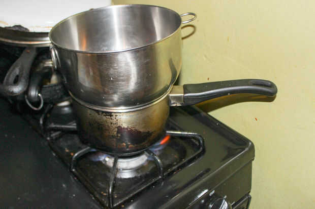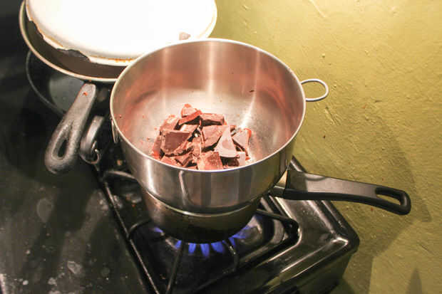El chocolate, me derrito. No tengo microondas, lo puse en un recipiente, que poner en una olla de agua, que calienta. Esto hace que el chocolate derrita lentamente. También se puede utilizar un microondas, en bajo y la mezcla cada 30 segundos o menos.
