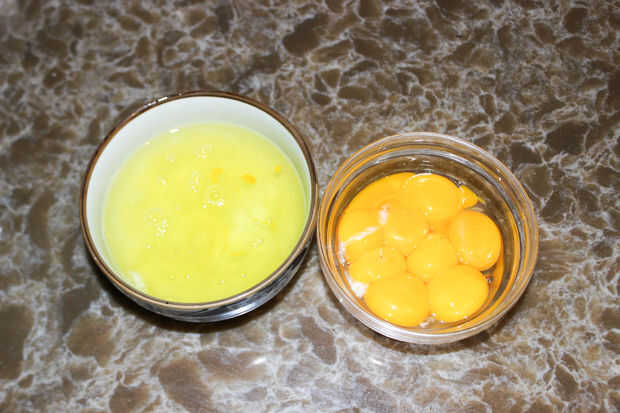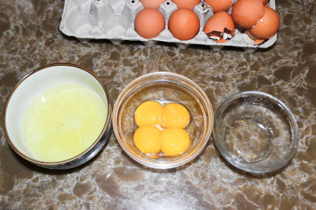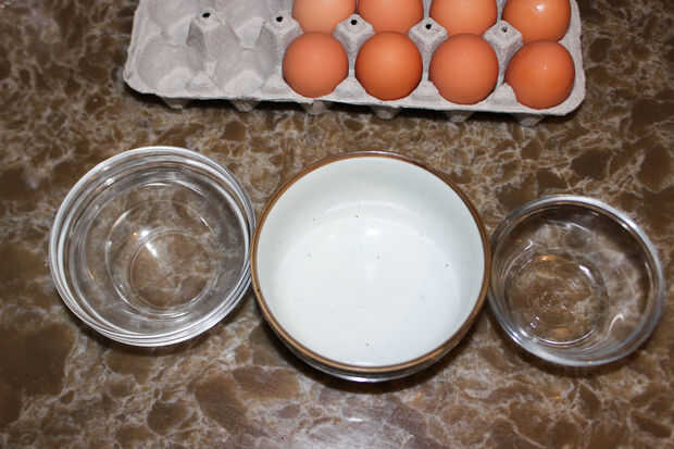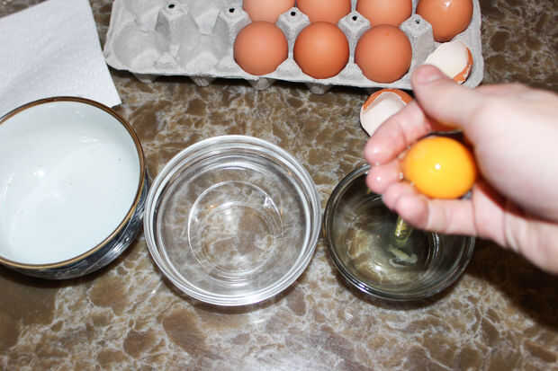 Establecer 3 tazones de fuente, romper los huevos en el tazón de fuente A. Luego, toma mis manos (limpias), poner en ella y levante ligeramente la yema de huevo, dejando el blanco. Luego pongo la yema de huevo en el recipiente B. Puedo vaciar el huevo en el tazón de fuente de C. Esto deja A tazón de fuente vacío y listo para el siguiente huevo. Utilizo este tazón de fuente de A para que, en caso de romper la yema y se mezcla con los blancos, es sólo un huevo en mal estado y no todos.