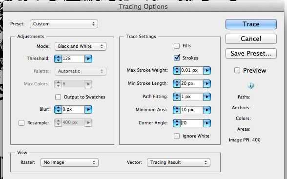 Importar el PSD en Illustrator, y luego ir a objeto > Calco > Opciones de rastreo. Utilice los ajustes de la imagen de arriba. La imagen resultante está muy cerca de la original, pero en forma de línea vectorizada.