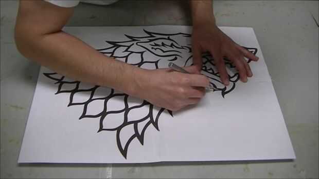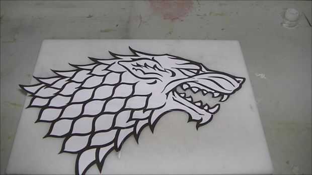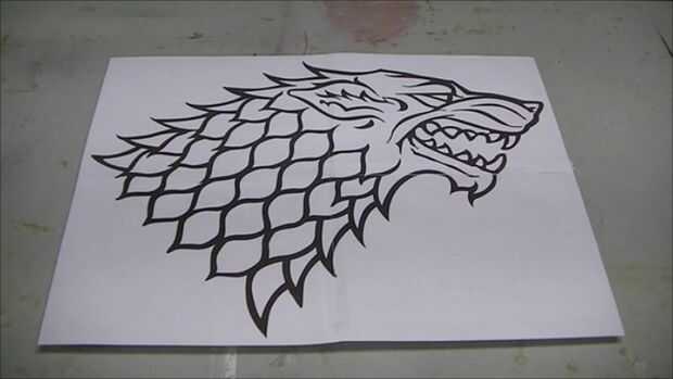 Esta es una plantilla que hice de una imagen de un lobo huargo, el sigil familia Stark, encontré en línea. Se imprime en 45 hojas de papel que son pegadas juntas. Yo uso un cuchillo del Exacto para cortar la plantilla.