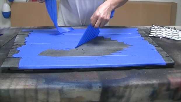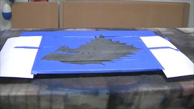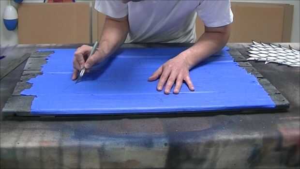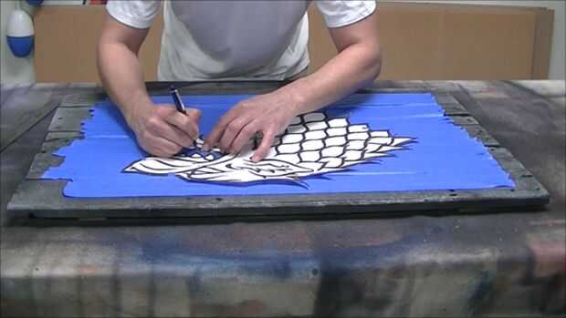 Después que enmascarados fuera de la zona donde iría el lobo huargo. Recomiendo sólo grabación de toda la superficie en este punto, ahorrar tiempo a largo funcionará. A continuación traza la silueta del lobo huargo en la superficie utilizando la plantilla. Luego corta la silueta con una navaja y despegado de la cinta. Trate de tener cuidado de sacar la cinta como esto puede ser usado de nuevo en un paso posterior en el proceso.