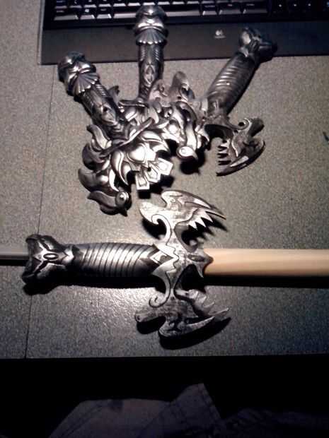 Tiene unas espadas de juguete y un escudo con un tyrep sin apretar alrededor de la punta de las espigas.