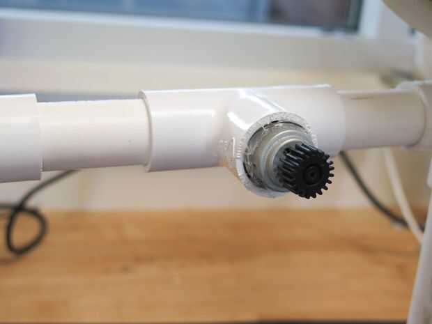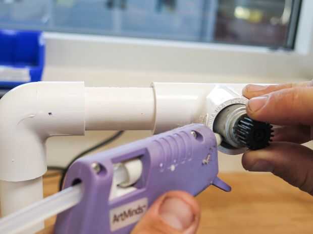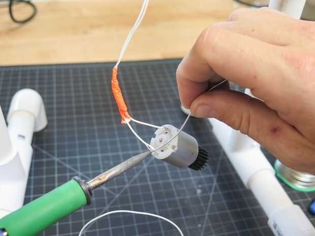 La soldadura de los extremos de dos hilos que salen de la Unión en T a los bornes de su motor. Pegamento caliente el motor en lugar cómodo en el empalme de T. También nos pegan un pequeño engranaje en nuestro extremo del motor para dar una buena base para las aspas del ventilador.