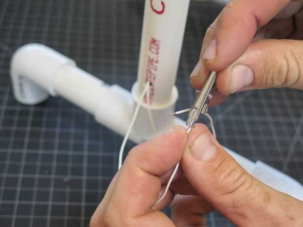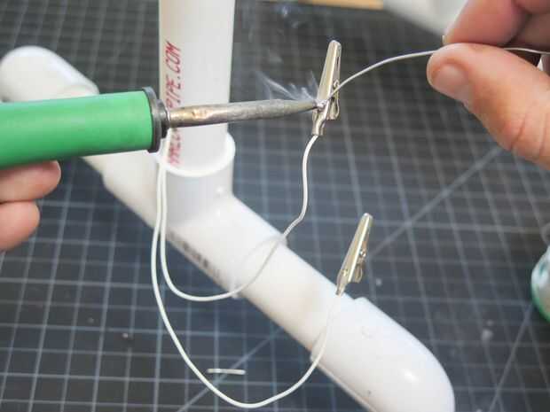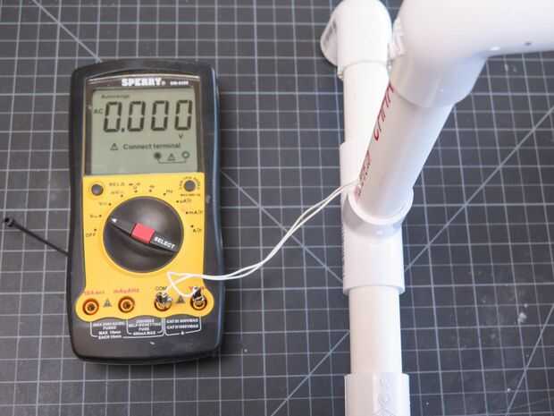En el otro extremo, tira de los extremos de dos hilos que salen del agujero de taladro y soldadura en clips de gator (o banana si lo prefiere). Estos pueden ir derecho en el voltímetro y esto nos dirá acerca de cuántos Voltios nuestro aerogenerador produce en un momento dado.