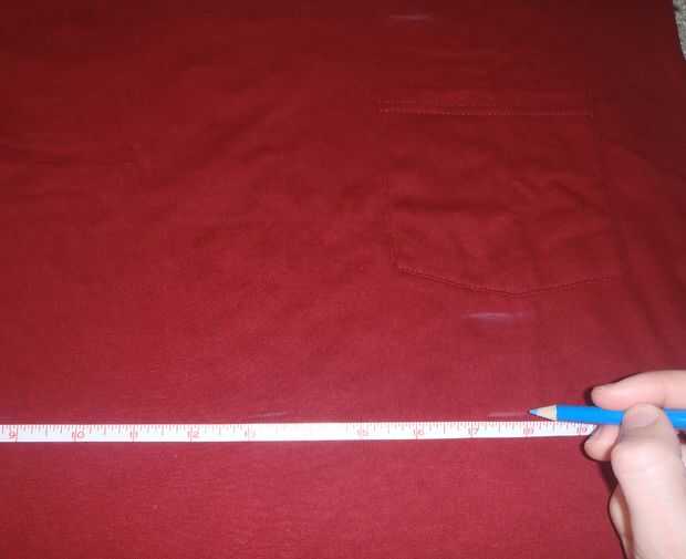 Coloque la cinta métrica paralela a la línea superior recién dibujada y recién dibujado línea de fondo para hacer unas líneas pequeñas más directamente a través de la camisa para usar como guías de corte.