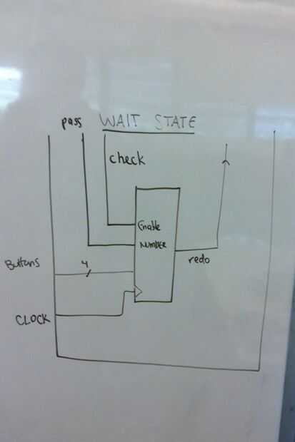 Además, en el estado de espera, si coincide con el número y el botón, rehacer se envía una señal hacia atrás hasta el estado de la pantalla para iniciar el ciclo de reproducción de nuevo. El estado de espera se activa mientras el contador está en alto ("cuenta"). El jugador pierde cuando el contador es bajo y el jugador no ha presionado el botón correcto.