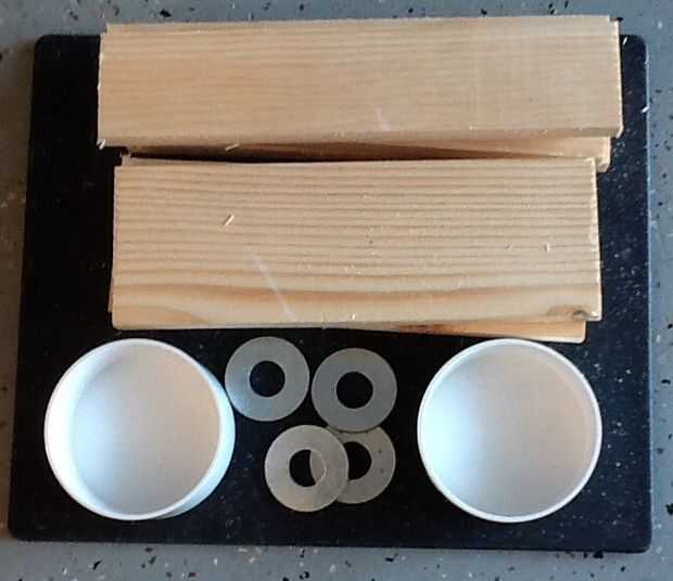 me gusta utilizar pino y dejarlo sin tratamiento. Envejece bien y adquiere una pátina. Sí, se convertirá muy abollada de las arandelas de acero pero le da carácter. También se podrían utilizar madera contrachapada o cualquier desechos que tienes. He utilizado 8 pies de pino de 1 x 10. Necesitarás 4 arandelas, unos 2 1/4 de pulgada de diámetro. Home Depot # 3263 funcionó a la perfección. Para el tubo encontré que dos tapas de PVC de 4 pulgadas fueron excelentes ya que son fáciles de fijar a la madera ver tienen un fondo. Cola blanca y algunos 1 1/2" clavos de acabados se utilizan para unir todo.