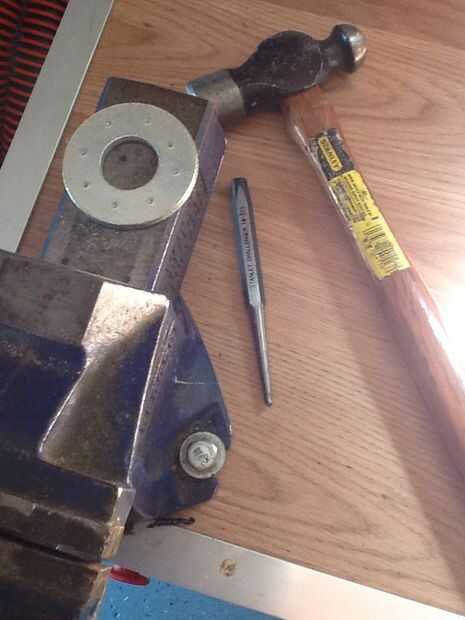 Dos arandelas pueden dejarse como está. Los otros dos se deben marcar de alguna manera a hacerlas diferentes. Seguro que usted puede pintarlos. Me pareció más fácil apoyarlas en una superficie de metal duro-a seguido de un granete y un martillo para crear un patrón que se distingue de los llanos. La pintura se va desgastando. Marcas de punzón no.
