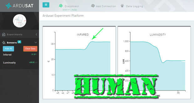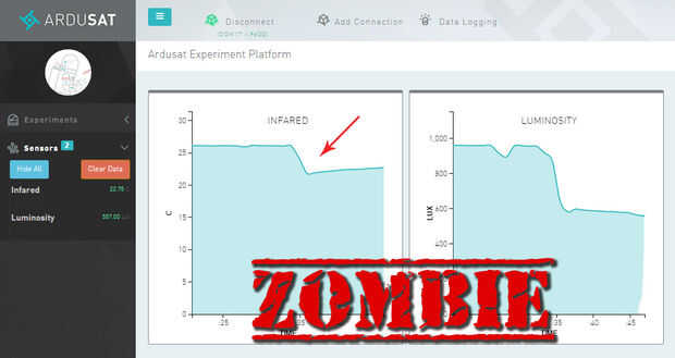 Mano de zombie debe estar fría (de sostener la lata fría de soda) y la plataforma de experimento Ardusat debe mostrar una caída en la temperatura.