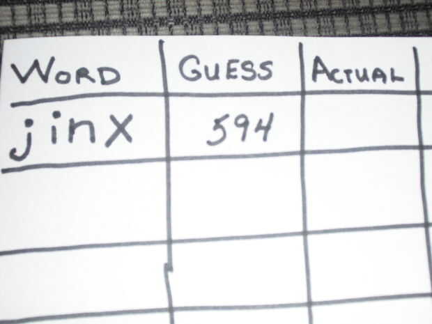 Mi primera palabra es «j n x ". Mi conjetura es que se encontrará en la página 594.