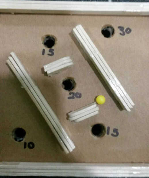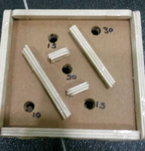 Empujar los agujeros, colocar los puntos y coloque los obstáculos. Estoy usando una bala de pistola para jugar al juego. También añadir otro cuatro conjuntos de garrapatas sobre el trozo de cartón para evitar que la bala de la pistola de caer. Recuerde que inicialmente hicimos un juego de palillos acortados. Es donde la bala de pistola saldrá de después que cae en cualquier agujero.