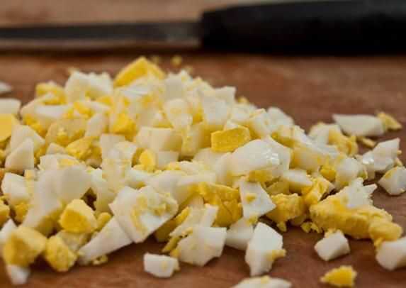 Chop por cuatro duros huevos duros con la mano.  Un procesador puede convertirlos para pegar.  Añadir los huevos picados al bol para mezclar.