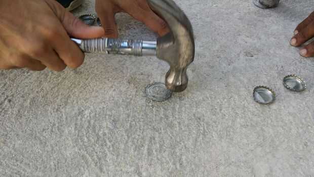 Para aplastar la tapa procedemos a martillar la tapa sobre una superficie plana. Primero se martilla la parte inferior de la tapa para evitar la tapa pierda su forma, luego la giramos para aplastar el lado contrario.