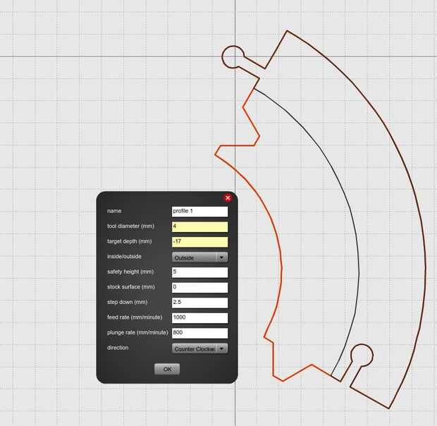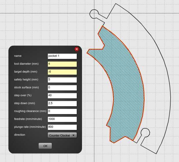 Utilizar la herramienta en línea gratuita camino generador makercam para hacer mis trayectorias de herramienta, simplemente abra el SVG en makercam [Asegúrese de ir a opciones de makercam y cambiar el dpi de importación a 90 ya que es un archivo de inkscape] y seleccione la sección más pequeña -i ello, destacando la curva interior es no sólo una en ambos caminos. Establecer aquí un bolsillo, luego seleccione la parte superior y hacer un perfil exterior para cortar toda la pieza.