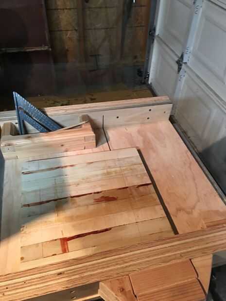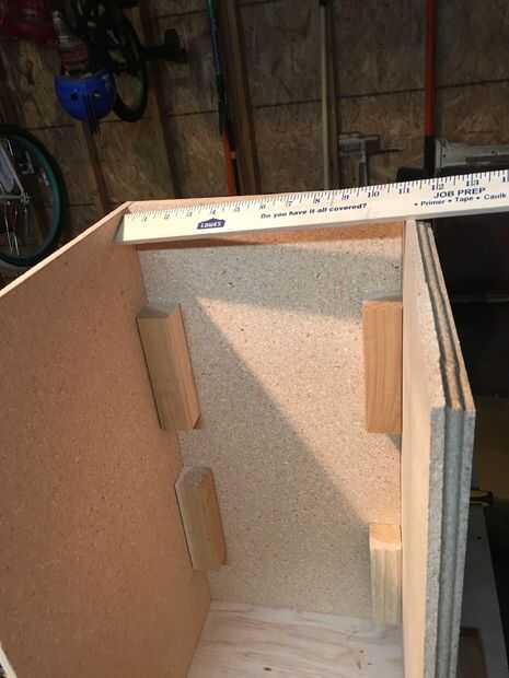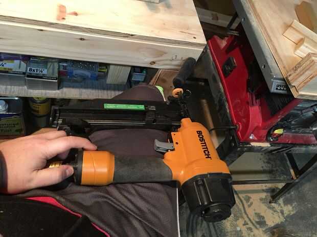 Con la ayuda de algunos pedazos de mierda de 2 x 2 comienzo clavado las dos partes y unirlas a la pieza, usé 2" clavos de 16g esta parte para hacerla un poco más fuerte. Después de que tenía la espalda y los lados juntos me cambié a mi arma de 18g y utilizando clavos de 1.5' clavar los lados directamente a la pared posterior para que sella el espacio que quedaron después de se había clavado la caja por el apoyo 2 x 2 "s, ahora medir la apertura y corte la tabla inferior de la caja y fijarlo del mismo modo